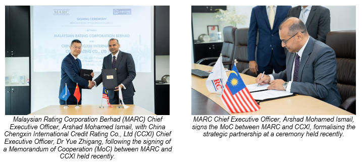 Malaysian Rating Corporation Berhad (MARC) and China Chengxin International Credit Rating Co., Ltd (CCXI), one of China’s leading credit rating agencies, formalised a strategic partnership through the signing of a Memorandum of Cooperation (MoC) at MARC’s headquarters in Kuala Lumpur on 23 July 2025. The MoC signifies a shared commitment to strengthening cross-border collaboration in credit rating, macroeconomic research, and sustainable finance initiatives between Malaysia and China.