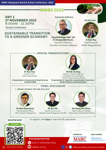 Malaysian Rating Corporation Berhad (MARC) will be hosting its annual MARC Malaysian Bond & Sukuk Conference (MMBS 2023), a three-day virtual event. The conference is scheduled to take place from November 27 to 29, 2023, running from 9:00 am to 12:00 pm each day. The keynote address will be delivered by Datuk Seri Dr Awang Adek Hussin, the Executive Chairman of Securities Commission Malaysia.