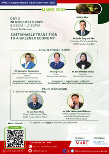 With a dedicated focus on sustainability, MMBS 2023 will feature expert speakers from renowned organisations such as AXA Investment Management, Maybank Asset Management Sdn Bhd, Hong Leong Investment Bank Berhad, Malakoff Corporation Berhad, RDS Advocates and Solicitors, Leader Energy Holding Berhad, Sustainable Energy Development Authority Malaysia (SEDA), Yinson Holdings Berhad, MioTech, and Energy Commission Malaysia. Moody's Investors Service is MARC's event partner for MMBS 2023.