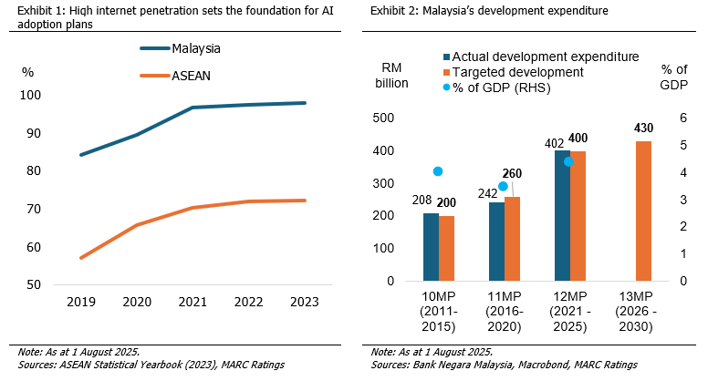 The overarching theme of the 13MP is “Melakar Semula Pembangunan”, meaning “Redesigning Development”, and it continues to build on the MADANI framework. National strategic master plans such as the National Semiconductor Strategy (NSS), New Industrial Master Plan (NIMP), and National Energy Transition Roadmap (NETR) remain central to Malaysia’s long-term development. A key focus of the 13MP is to position Malaysia as a regional hub for digital and artificial intelligence (AI). Malaysia is well-positioned to realise this ambition, with internet penetration reaching 98.0% in 2023 — well above the ASEAN average. Efforts to expand 5G coverage to 98% nationwide by 2030 are also underway, further strengthening digital infrastructure. Additionally, the National AI Plan 2030 provides a comprehensive framework to guide Malaysia’s advancement in this field.