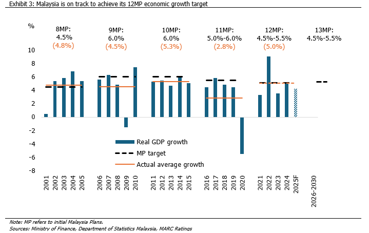In the 13MP, the government is targeting an annual gross domestic product (GDP) growth rate of 4.5% to 5.5%, moderating from the 12MP mid-term review target of 5.0% to 5.5%. At present, Malaysia is on track to achieve its 12MP growth target. The moderation in the 13MP’s GDP growth target appears reasonable, considering the decade-average GDP growth rate of 4.2% (2014-2024). Historically, some 12MP targets appeared ambitious, which, for example, can be evaluated via achievement levels in 2024, including gross national income (GNI) per capita (2024: RM56,718; target: RM61,000), labour productivity growth (2024: 2.4%; target: 3.6%), and fiscal deficit (2024: 4.1% of GDP; target: 3.0%-3.5% of GDP). Under the 13MP, several headline targets remain unchanged from the initial 12MP, including labour productivity growth (3.6% p.a.), and headline inflation (2% to 3%).